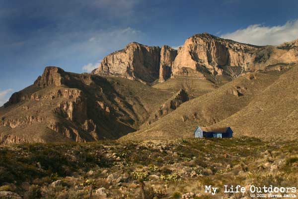 Just off of hwy 62, about 7.3 miles down a rough jeep road, an old ranch house sits at the foot of Texas’ highest peaks. The blue ranch house with its steeply gabled roof looks somewhat out of place among the open desert landscape. It must have felt out of place, as well, when the builder had the lumber hauled 70 miles by mule from Van Horn, Texas. you can’t help but wonder how hard it must have been to travel this region by wagon as you drive the rugged 4×4 road that violently tosses your vehicle side to side.