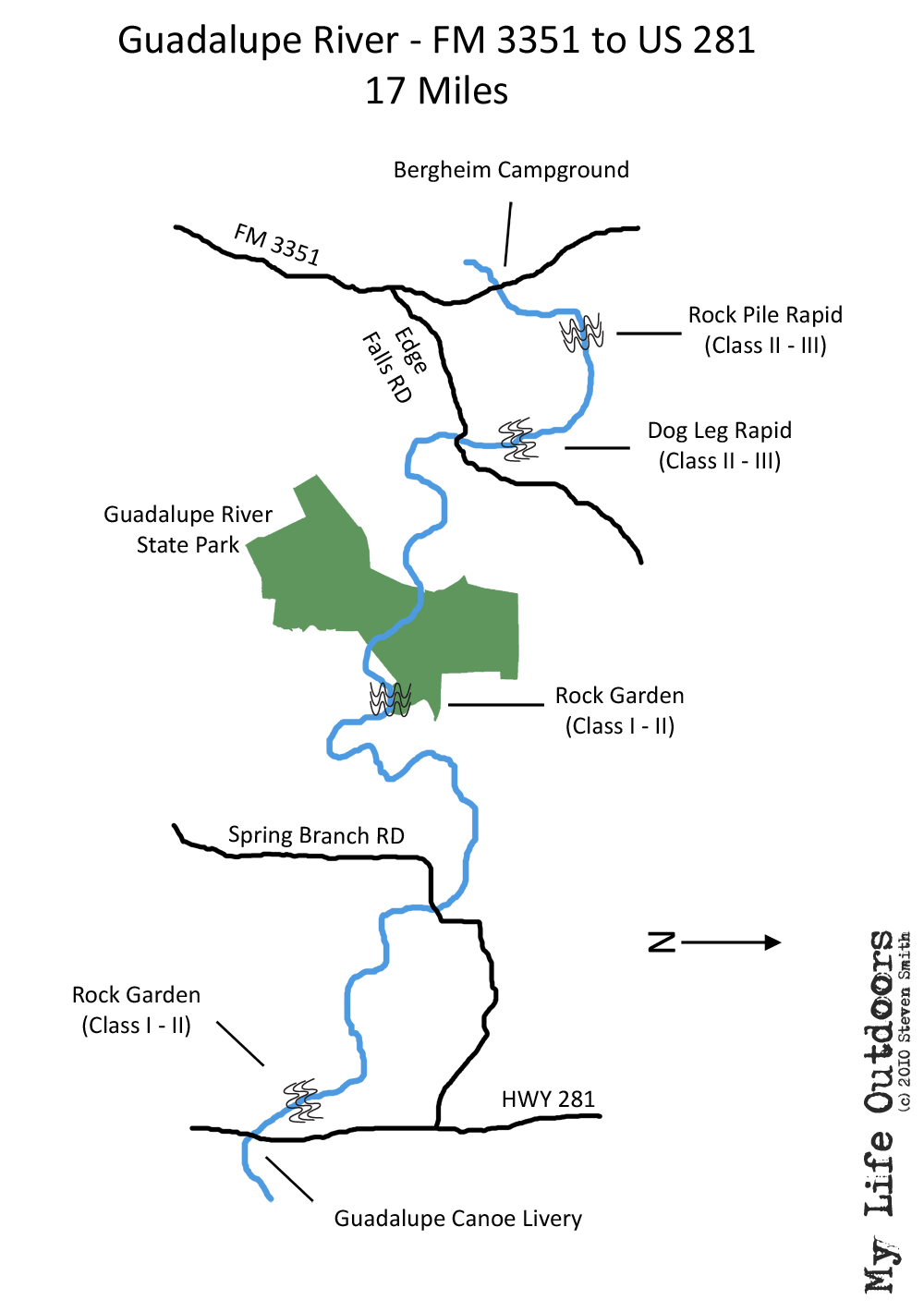 This section of the Guadalupe relies mostly on springs for its flow giving it remarkable water quality. There are number of rapids along this section of the Guadalupe, most remain nameless class I to II rapids. Rock Pile rapid is the first significant rapid about one mile below the FM 3351 put in. Rock Pile is rated class II to III. Another couple of miles downstream and you will encounter Dog Leg Rapid, another class II to III that can be dangerous if not run properly. Be sure to scout and pick your line carefully.